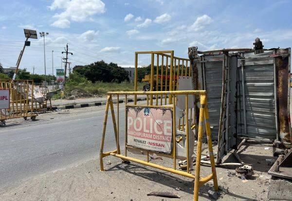 ஒரகடத்தில் மேம்பால பணிகள் முடிந்தும், அகற்றப்படாமல் சாலையில் வைக்கப்பட்டுள்ள பேரிகேடால் வாகன ஓட்டிகள் விபத்தில் சிக்கி வருகின்றனர்.