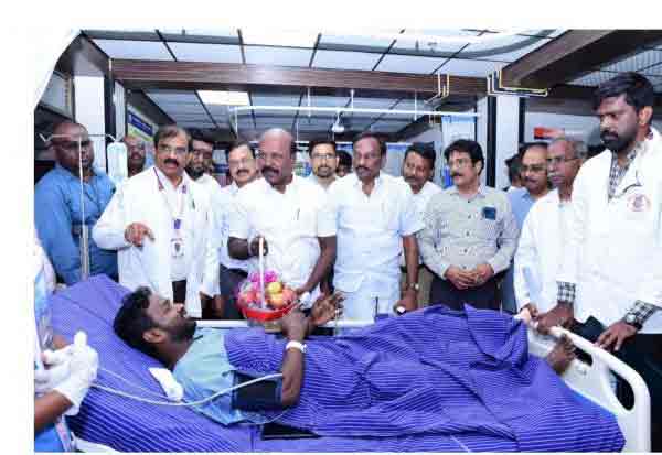இன்னுயிர் காப்போம்- திட்டத்தில் ௪ லட்சம் பேர் பயனடைந்துள்ளனர்,இத்திட்டத்தின் கீழ் பாரிவாக்கத்தை சேர்ந்த மணிகண்டன் என்பவர் 4-வது லட்சம் நபராக தனியார் மருத்துவமனையில் சிகிச்சை பெற்று வருகிறார். அவரை அமைச்சர் சுப்பிரமணியன் நேரில் சந்தித்து நலம் விசாரித்தார்.