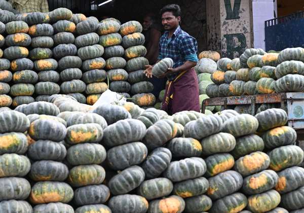 சென்னை கோயம்பேடு மார்க்கெட்டிற்கு ஆந்திர மாநிலத்திலிருந்து அதிக அளவில் விற்பனைக்கு குவிந்துள்ள சர்க்கரை பூசணிக்காய்கள்.