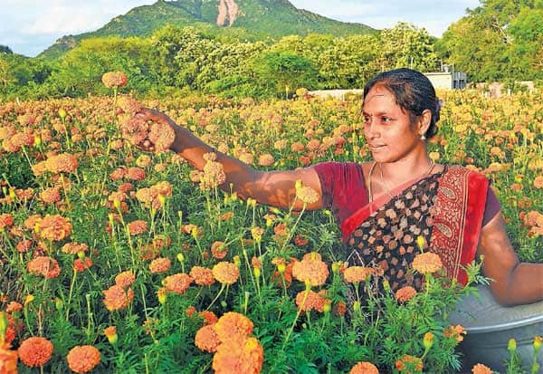 பூத்து குலுங்கும் கேந்தி மலர்கள்: சமய வழிபாடுகளிலும், பண்டிகை காலங்களிலும் அதிகம் பயன்படுத்தப்படும் அழகிய கேந்தி மலர், திருவண்ணாமலை வட்டாரத்தில் இந்த ஆண்டு வழக்கத்தைவிட அதிகமாக பூத்துள்ளது. கேந்தி மலர்களை மகிழ்ச்சியுடன் பறிக்கும் விவசாய பெண்; பின்னணியில் அண்ணாமலையார் மலை. இடம்: அத்தியந்தல்.