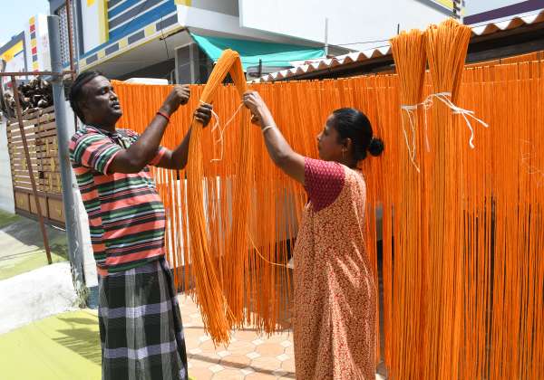 உடுமலை வரதராஜபுரத்தில் கயிறு கட்டி காய வைக்கப்பட்டுள்ள மஞ்சள் தாலி கயிறுகள்.
