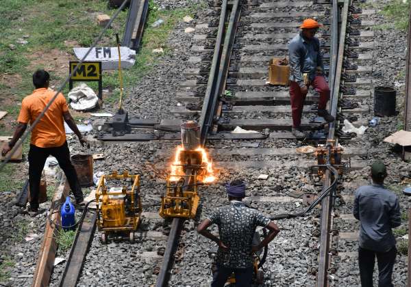 சென்னை பேசின் மேம்பாலம் ரயில் நிலையம் அருகே தண்டவாள விரிசல்களை பராமரிக்கும் பணியில் ஈடுபட்டுள்ள ரயில்வே ஊழியர்கள்.