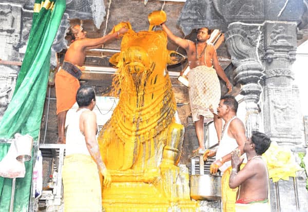 திருவண்ணாமலை அருணாசலேஸ்வரர் கோவிலில், ஆனி மாத வளர்பிறை பிரதோஷத்தையொட்டி, ராஜகோபுரம் அருகே உள்ள பெரிய நந்திய பகவானுக்கு மஞ்சள் அபிஷேகம் நடந்தது.