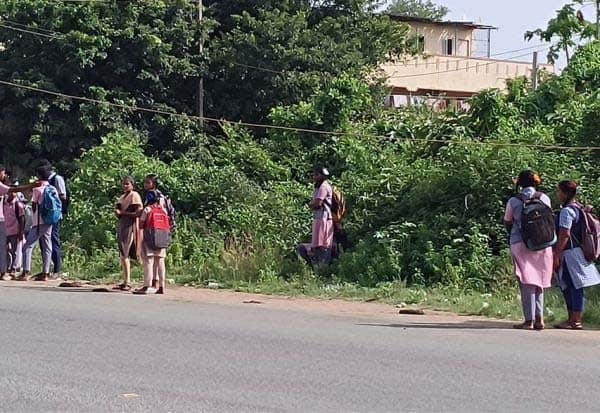 திருமழிசை-ஊத்துக்கோட்டை நெடுஞ்சாலையோரம் பயணியர் நிழற்குடை இல்லாததால் மாணவ-மாணவியர் சிரமமடைந்த வருகின்றனர். இடம்: நேமம்.