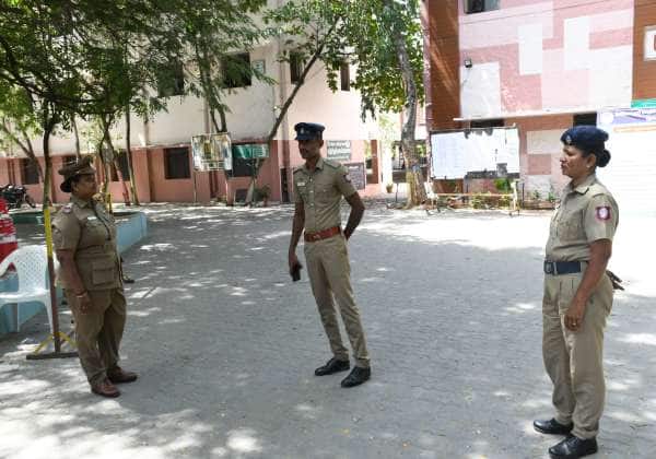 குருப் 4 தேர்வு நடக்கும் மையங்களில் போலீஸ் பாதுகாப்பு போடப்பட்டிருந்தது. இடம்: ஜெய்வாபாய் பள்ளி, திருப்பூர்.