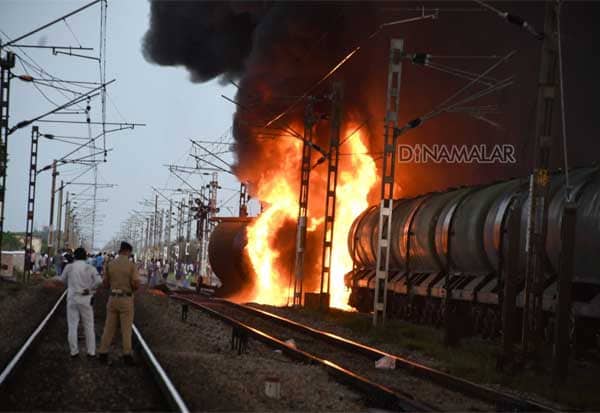 சென்னை துறைமுகத்தில் இருந்து எரிபொருள் ஏற்றிச்சென்ற சரக்கு ரயில் திருவள்ளூர் அருகே தடம் புரண்டு தீ விபத்து ஏற்பட்டது.