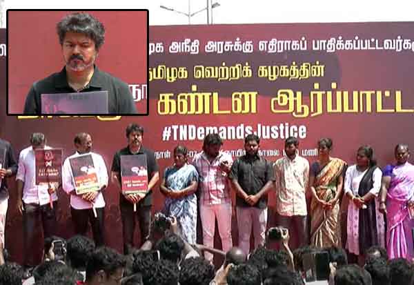 சிவகங்கை மாவட்டம், திருப்புவனத்தில் போலீசார் தாக்கியதில், கோவில் காவலாளி அஜித்குமார் உயிரிழந்ததற்கு நீதி கேட்டு, த.வெ.க.,சார்பில் நடந்த ஆர்ப்பாட்டத்தில் அக்கட்சி தலைவர் விஜய் பங்கேற்றார். இடம்: சென்னை
