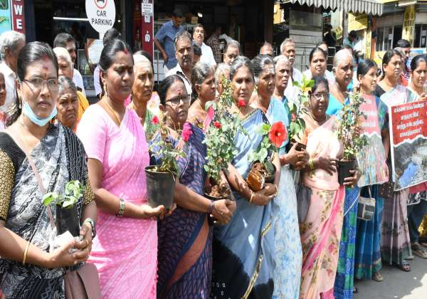 திருப்பூர் மாநகராட்சி பகுதியில் சேகரமாகும் குப்பைகளை, ஜி.என். கார்டன் பகுதியில் பாறைக்குழியில் கொட்டுவதை கண்டித்து, மேயருக்கு பூ செடி கொடுக்கும் போராட்டம், மாநகராட்சி அலுவலகம் முன்பு நடந்தது.