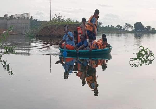 மேட்டுப்பாளையம் சிறுமுகை அருகே உள்ள லிங்காபுரம் பாலம் நீரில் மூழ்கிய நிலையில் பள்ளி மாணவர்கள் பரிசல் பயணம் மேற்கொண்டுள்ளனர்