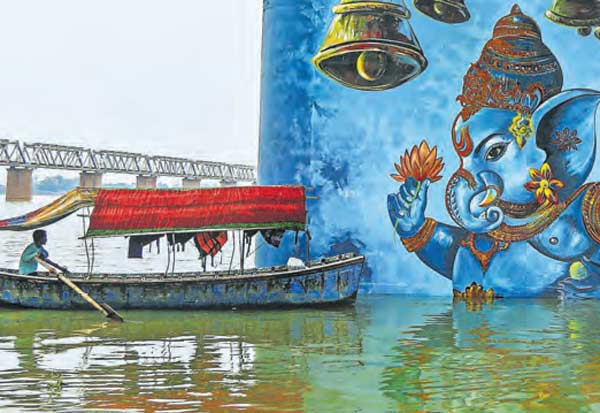 கனமழை காரணமாக கங்கையில் பெருக்கெடுத்து ஓடும் வெள்ளம் கரைகளை தொட்டுக் கொண்டு செல்கிறது. எப்போது வேண்டுமானாலும் ஊருக்குள் புகுந்துவிடும் நிலையில் அச்சத்துடன் படகுவிடும் படகோட்டி. இடம்: பிரயாக்ராஜ், உ.பி.,