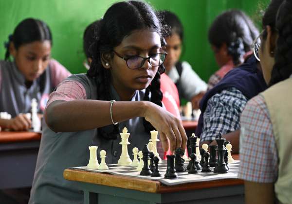 கோவை புரூக்பாண்ட் ரோடு தேவாங்க மேல்நிலைப்பள்ளியில் நடந்த குறுமைய போட்டிகளில் செஸ் போட்டியில் திறமையை வெளிப்படுத்திய மாணவர்கள்.