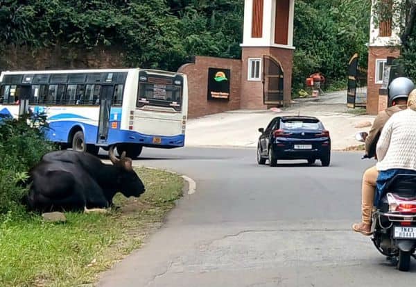 குன்னுார்; குன்னுார்-- ஊட்டி சாலையில் வளைவான பகுதியில், ஓய்வெடுக்கும் காட்டெருமையால் பைக்கில் செல்பவர்கள் அச்சத்துடன் செல்கின்றனர்.