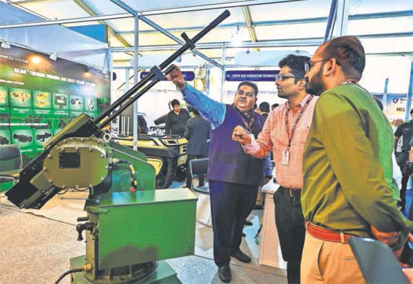 ராஜஸ்தானின் ஜெய்ப்பூரில் உள்ள ராணுவ தளத்தில், இந்திய பாதுகாப்பு உற்பத்தியாளர்கள் சங்கம் ஏற்பாடு செய்த ராணுவ தளவாட கண்காட்சியில் வைக்கப்பட்டிருந்த நவீன ராணுவ உபகரணங்களை பார்வையிட்ட பார்வையாளர்கள்.