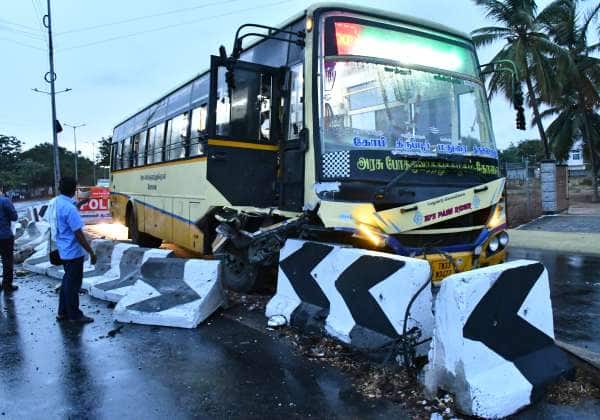 திருப்பூர், தாராபுரம் ரோடு கே.செட்டிபாளையம் அரசு மேல்நிலைப்பள்ளி அருகே வளைவில் கட்டுப்பாட்டை இழந்த அரசு பஸ் மையத்தடுப்பில் மோதி விபத்துக்குள்ளானது.