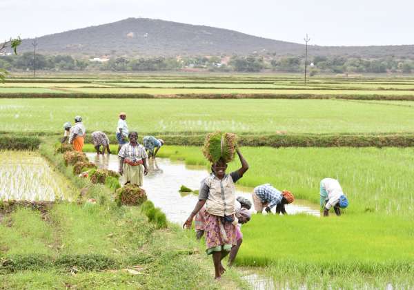 திருநெல்வேலி மாவட்டம் படப்பகுறிச்சி பகுதியில் வயல்களில் நடுவதற்காக நெல் நாற்றுக்களை தலையில் சுமந்து செல்லும் பெண்...