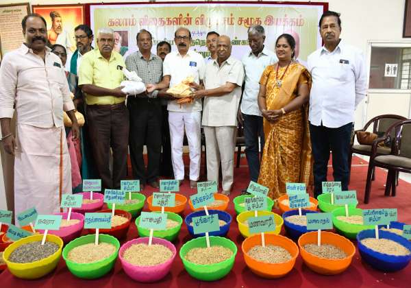 புதுச்சேரி தமிழ் சங்கத்தில் நடந்த கலாம் விதைகளின் விருட்சம் சமூக இயக்கம் சார்பில் நடந்த விழாவில் தலைவர் முத்து வீரியமிக்க நெல் விதைகளை வழங்கினார்.