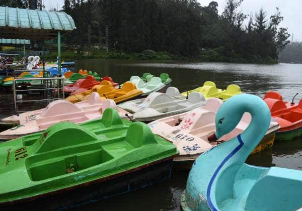 ஊட்டி படகு இல்லத்தில், மழை மற்றும் காற்று காரணமாக மிதிபடகு சவாரி நிறுத்தப்பட்டுள்ளது.