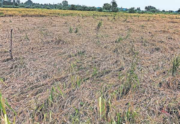 கதிர் வந்த நிலையிலான நெற்பயிர்கள் மழை காரணமாக நிலத்தில் சாய்ந்து உள்ளன.இடம்: அரும்புலியூர்.