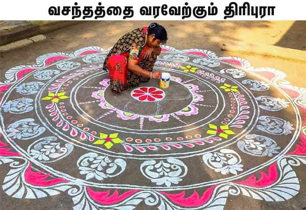 தமிழகத்தில் கொண்டாடப்படும் உழவர் திருநாளான பொங்கல் பண்டிகை, வட மாநிலங்களில் மகர சங்கராந்தி என்ற பெயரில் அறுவடைத் திருவிழாவாக கொண்டாடப்படுகிறது. இதையொட்டி வடகிழக்கு மாநிலமான திரிபுரா தலைநகர் அகர்தலாவில், வீட்டின் முன் பிரம்மாண்டமான வண்ணக்கோலமிட்ட பெண்.