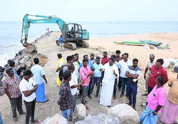 புதுச்சேரி அடுத்த பெரிய காலாப்பட்டு கடற்கரை பகுதியில் மணல் அரிப்பை கட்டுப்படுத்த கல்யாணசுந்தரம் எம்.எல்.ஏ., ஆய்வு செய்தார்.
