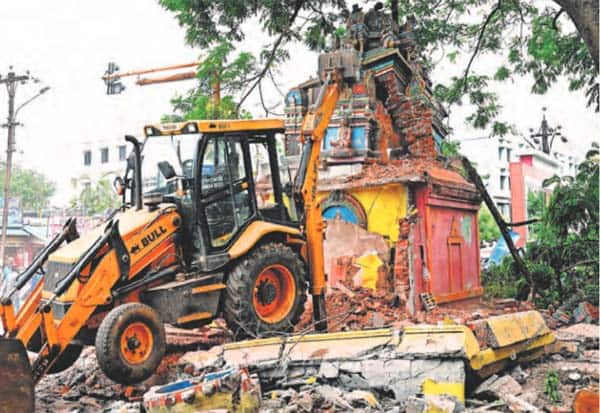 ரோடு விரிவாக்கப்பணிக்காக மதுரை கலெக்டர் அலுவலக ரோட்டில் உள்ள ஐயப்பன் கோயில் அகற்றப்பட்டது.