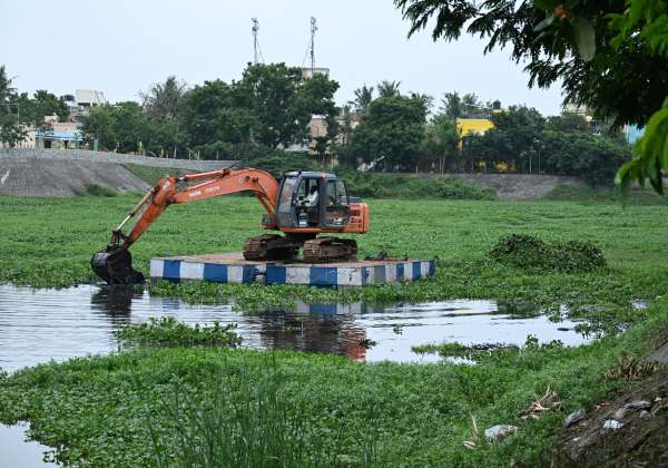 பருவமழை முன்னெச்சரிக்கை நடவடிக்கையாக, கொரட்டூர் ஏரியில் உள்ள ஆகாயத்தாமரை செடிகள் தூர்வாரப்பட்டு வருகின்றன.
