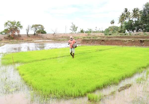 நெல் நாற்று நடவு செய்வதற்காக அமைத்துள்ள நாற்றங்காலில் உரமிடும் விவசாயி.இடம்: உடுமலை அருகே மடத்துகுளம்.
