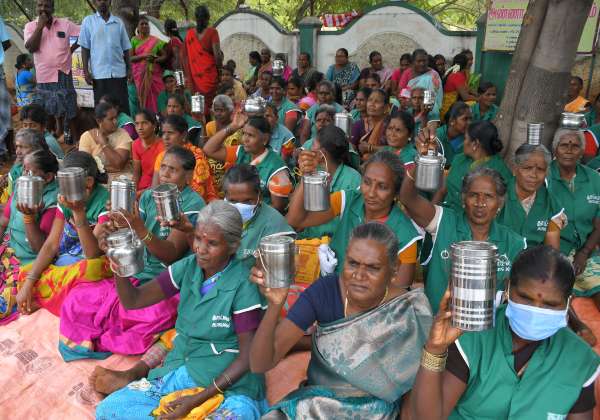 தேனி கலெக்டர் அலுவலகம் முன் 9 அம்ச கோரிக்கைகளை வலியுறுத்தி ஊரக வளர்ச்சித்துறை தொழிலாளர்கள் சங்கத்தினர் உணவு பாத்திரத்துடன் காத்திருப்பு போராட்டத்தில் ஈடுபட்டனர்.