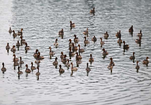 சென்னையில் காலை முதல் லேசான சாரல் மழையுடன் இருந்த வானிலையில் கூட்டமாக ஏரியில் இரை தேடும் முக்குளிப்பான் நீர்ப் பறவைகள்.இடம் : பெருங்குடி