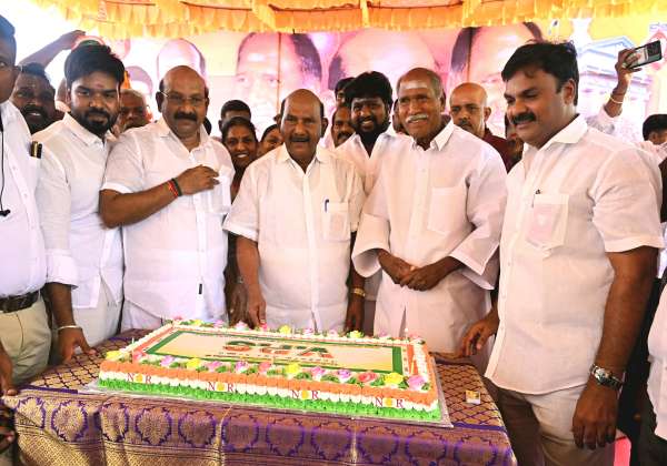 புதுச்சேரி முன்னாள் சபாநாயகர் சிவக்கொழுந்து தனது பிறந்த நாளை முன்னிட்டு முதல்வர் ரங்கசாமி முன்னிலையில் கேக் வெட்டி கொண்டாடினார்.அருகில் பா.ஜ. மாநில தலைவர் ராமலிங்கம்,சப்தகிரி குழுமம் ரமேஷ்.
