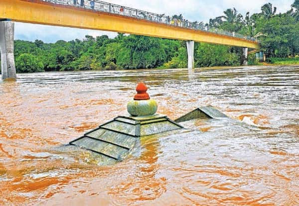கர்நாடகாவின் துங்கா ஆற்றில் வெள்ளப்பெருக்கு ஏற்பட்டதையடுத்து, அங்குள்ள கோவில் கோபுரம் மூழ்கியது. இடம்: சிருங்கேரி.