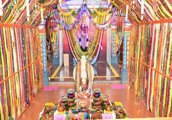 ஆடி பூரம் முன்னிட்டு கோவை ரேஸ்கோர்ஸ் பகுதியில் உள்ள சாரதாம்பாள் கோவிலில் வளையல்களால் அலங்கரிக்கப்பட்டு பக்தர்களுக்கு அருள் பாலித்த சாரதாம்பாள்.