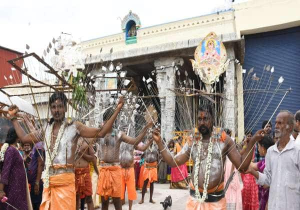 படம் சீனிவாசன் திருவள்ளூர் மாவட்டம் திருத்தணி சுப்பிரமணி சுவாமி கோவிலில் ஆடிப்பூரம் முன்னிட்டு உடலில் வேல் அலகு குத்திக்கொண்டு நேர்த்திக்கடன் செலுத்தினர்