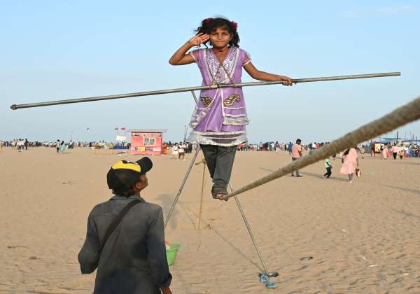 குழந்தைகளை வைத்து பொது இடங்களில் பிச்சை எடுப்பதற்காக கயிற்றில் ஆபத்தான முறையில் நடக்க வைப்பது பல்வேறு இடங்களில் நடந்து வருகிறது.இடம் மெரினா கடற்கரை.