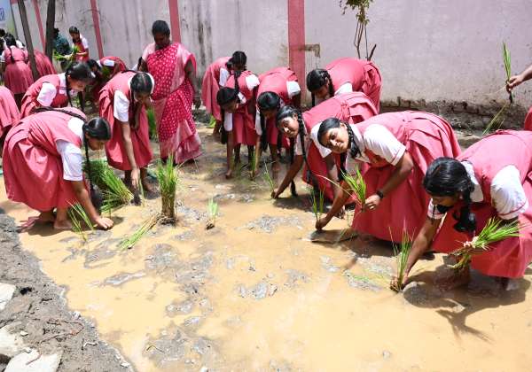 விவசாயம் குறித்த விழிப்புணர்வை ஏற்படுத்தும் விதமாக சென்னை புரசைவாக்கம் எஸ்.சி.எஸ்.ஐ. ஈவார்ட் பள்ளி மாணவிகளுக்கு நெல் நாற்று நடுவது உள்ளிட்ட பல்வேறு செய்முறைகள் செய்து காண்பிக்கப்பட்டது.