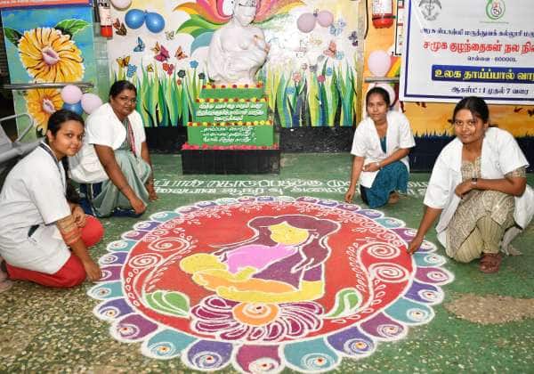 உலக தாய் பால் வார விழாவை முன்னிட்டு சென்னை ஸ்டான்லி மருத்துவமனையில் மாணவிகள் கோலமிட்டு விழிப்புணர்வு ஏற்படுத்தினர்.