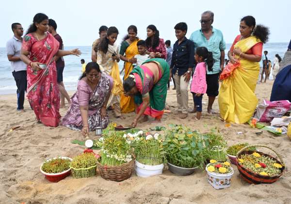 ஆடிப்பெருக்கை முன்னிட்டு மெரினா கடற்கரையில் ஏராளமானோர் குடும்பத்துடன் பூஜை செய்து வழிபட்டனர்.