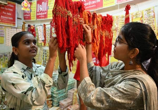 ரக்ஷா பந்தன் பண்டிகை வருவதையொட்டி தன் சகோதரர்களுக்கு அணிவிக்க ராக்கிகள் வாங்க வந்த பெண்கள். இடம்: கோவை இடையர் வீதி.