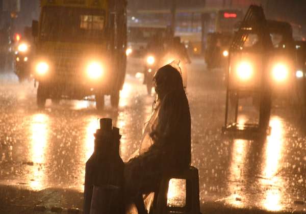 விழுப்புரத்தில் மழையில் நனைந்தபடியே பால் விற்பனை செய்ய காத்திருக்கும் பெண். இடம் கலெக்டர் அலுவலகம் முன்பு.