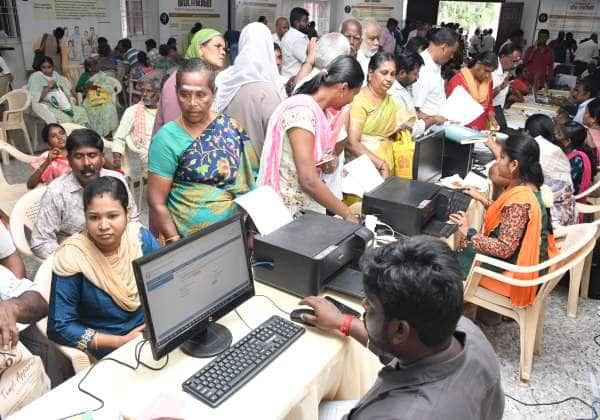 கோவை வெள்ளக்கிணறு ஆதி அறக்கட்டளை திருமண மண்டபத்தில் நடைபெற்ற உங்களுடன் ஸ்டாலின் முகாமில் வருவாய் மற்றும் பேரிடர் மேலாண்மை துறை அரங்கில் பட்டா மாறுதல், இணையவழி பட்டா பெறுவதற்காக காத்திருந்த மக்கள்.