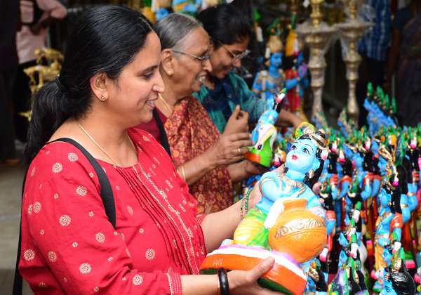 கோவை டவுன்ஹாலில் உள்ள பூம்புகாரில் கிருஷ்ண ஜெயந்தி ஒட்டி கிருஷ்ணர் பொம்மைகளை ஆர்வத்துடன் வாங்கும் பெண்கள்.