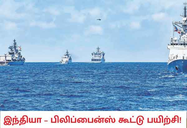தென் சீனக் கடல் பகுதிக்கு, நம் அண்டை நாடான சீனா முழுதும் உரிமை கோரி வருகிறது. அந்தப் பிராந்தியத்தில் உள்ள நாடுகள் இதற்கு எதிர்ப்பு தெரிவித்தாலும், அதை சீனா மதிக்கவில்லை. இந்நிலையில், இந்தியா மற்றும் தென்கிழக்கு ஆசிய நாடான பிலிப்பைன்ஸ் கடற்படைகளின் கூட்டுப் பயிற்சி முதல் முறையாக நடக்கிறது. சர்ச்சைக்குரிய தென் சீனக் கடல் பகுதியில், பிலிப்பைன்ஸ் அருகே கூட்டுப் பயிற்சியில் நேற்று ஈடுபட்ட இரு நாட்டு கடற்படை போர்க்கப்பல்கள்.