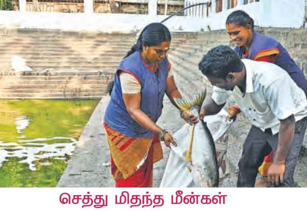 திருவொற்றியூர் தியாகராஜ சுவாமி உடனுறை வடிவுடையம்மன் கோவிலின் பிரம்ம தீர்த்த குளத்தில், சிறிய மீன்கள் முதல் பெரிய மீன்கள் வரை செத்து மிதந்தன. அவற்றை அகற்றும் பணியில், நேற்று ஊழியர்கள் ஈடுபட்டனர். அதிகாரிகள் கூறுகையில் 'பிப்ரவரி மற்றும் ஆகஸ்ட் மாதங்களில் சீதோஷ்ண நிலை மாற்றத்தால், ஆக்சிஜன் பற்றாக்குறை ஏற்பட்டு மீன்கள் இறப்பது வழக்கம். நீர்வரத்து இருந்தால் அதிக பாதிப்பு இருக்காது' என்றனர்.