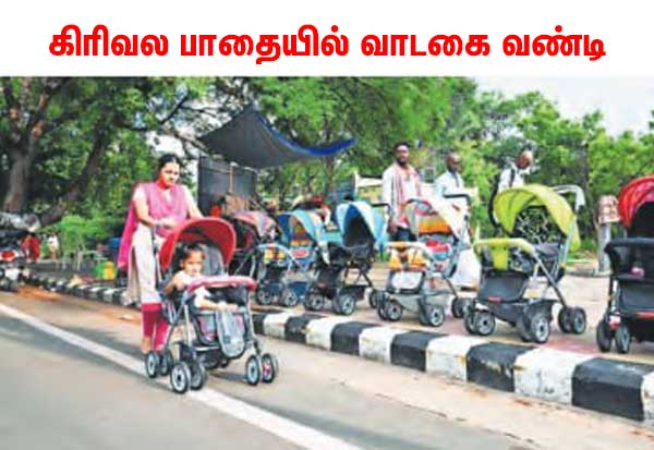 திருவண்ணாமலை கிரிவல பாதையில் குழந்தைகளுடன் வலம் வருபவர்கள் குழந்தைகளை தூக்கிக் கொண்டு கை வலிக்க 14 கிலோமீட்டர் நடப்பர். அந்த சிரமத்தை குறைக்கும் வகையில் 300 ரூபாய் வாடகை கொடுத்தால், அதற்கான வண்டியை வாடகைக்கு தருகின்றனர். அப்படி வாடகைக்கு எடுத்த வண்டியில் குழந்தையை அமர வைத்து தள்ளிக் கொண்டு சென்ற தாய்.