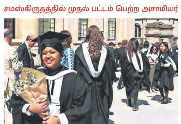 ஐரோப்பிய நாடான பிரிட்டன் தலைநகர் லண்டனில் உள்ள ஆக்ஸ்போர்டு பல்கலை.,யில் சமஸ்கிருதம், ஹிந்தி மொழியில் பட்டப்படிப்பை முடித்து அசத்தியிருக்கிறார், வடகிழக்கு மாநிலமான அசாமைச் சேர்ந்த 21 வயது ஹசாரிகா. இதன் மூலம் இப்பட்டம் பெற்ற முதல் அசாமியர் என்ற பெருமையை பெற்றார். பல்கலையின் புகழ் பெற்ற ஷெல்டனியன் அரங்கில் நடந்த பட்டமளிப்பு விழாவில் பட்டம் பெற்ற பூரிப்புடன் ஹசாரிகா.