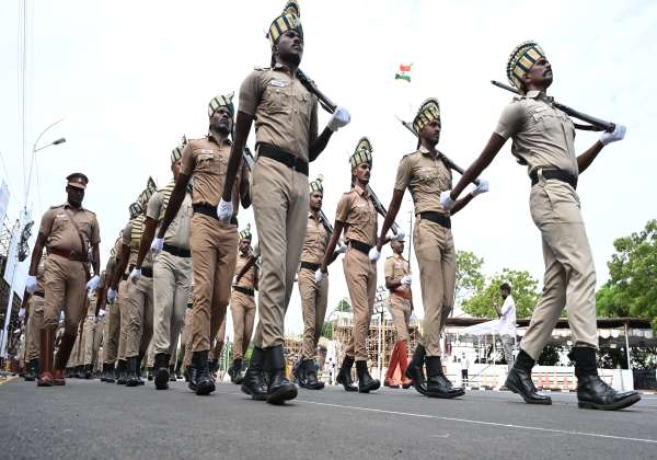 சுதந்திர தின விழாவை முன்னிட்டு சென்னை கோட்டை கொத்தளம் முன்பு அணிவகுப்பு ஒத்திகையில் ஈடுபட்ட காவலர்கள்.