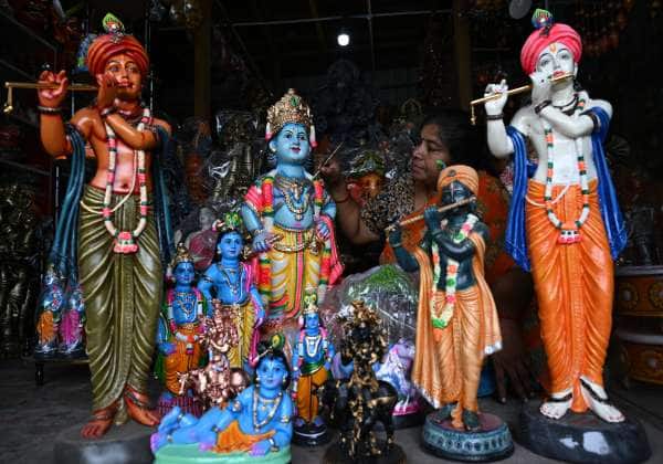 கிருஷ்ணஜெயந்தி விழா நெருங்கியுள்ளதை தொடர்ந்து கடைகளில் விற்பனைக்கு வந்துள்ள வண்ண வண்ண கிருஷ்ணர் சிலைகளை விற்பனைக்கு தயார் செய்யும் பெண். இடம் : இ.சி.ஆர், ஈஞ்சம்பாக்கம்