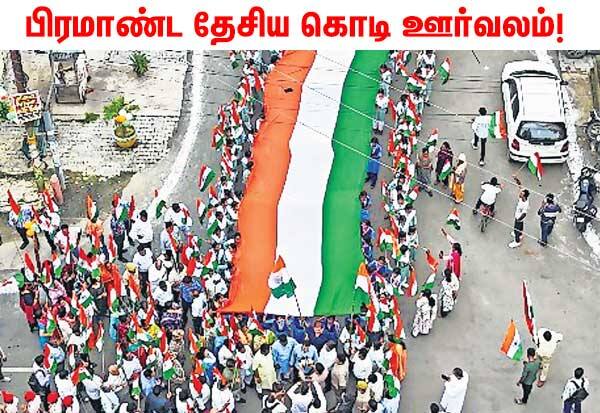 வீடுதோறும், வீதிதோறும் தேசியக்கொடி ஏற்றி சுதந்திர தினத்தை கொண்டாட வலியுறுத்தும், திரங்கா யாத்திரையில் பிரமாண்ட தேசியக்கொடி ஏந்தியபடி மக்கள் பங்கேற்றனர். இடம்: காஜியாபாத் உ.பி.,