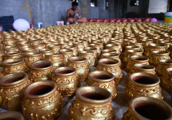 கிருஷ்ண ஜெயந்தியை முன்னிட்டு திருநெல்வேலி மாவட்டம் எட்டெழுத்து பெருமாள் கோவிலில் பக்தர்களுக்கு பிரசாதம் வழங்குவதற்காக தயாராகும் வண்ண மண்பாண்டங்கள்.