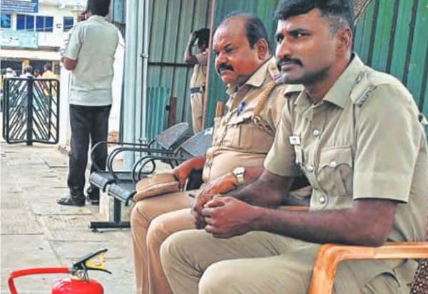 தீயணைப்பு துறைக்கு வந்த சோதனை; தேனி மாவட்ட கலெக்டர் அலுவலகத்தில், நடைபெறும் குறைதீர் கூட்டத்திற்கு, மனு அளிக்க வரும் சிலர், தீக்குளிக்க முற்படுவது அதிகரித்து உள்ளது. இதனால், தீக்குளிக்க முயற்சிப்போரை தடுக்கும் வகையில், கலெக்டர் அலுவலக நுழைவு வாயிலில் தீயணைப்பு கருவியுடன் காத்திருக்கும் தீயணைப்பு வீரர்கள்.